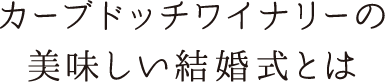 美味しいお料理とワイン、カーブドッチワイナリーならではのレストランウェディングに、お二人の笑顔が溢れます。ぶどう畑からそよぐ風と差し込む陽光が、ゲストのお席におふたりからの「美味しい時間」をお届けします。引き出物の一品にも感謝の「美味しい」を込めて。特別な一日を、お二人らしい美味しさで輝かせてください。